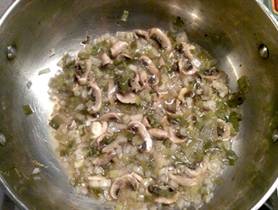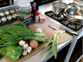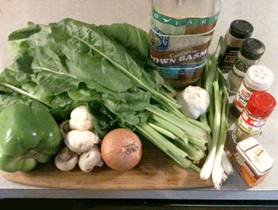 Get in Advance: 1 cup Basmati rice 1 small onion, chopped 1 garlic clove, minced 4 white mushrooms, sliced 3 green onions (scallions), minced 1 green/red pepper. Chopped 2 tablespoons of cider vinegar 1/2 teaspoon ground cumin ¼ teaspoon ground white pepper ½ teaspoon paprika ¼ teaspoon ground ginger ½ of ¼ teaspoon cinnamon 1/2 cup of low-salt low-fat vegetable broth 1 bunch of Swiss Chard, washed, long stems removed, roughly cut Have On Hand: ¼ cup of white vine |